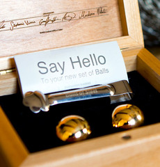 The Executive Set are a pair of 18K gold Balls of Steel from which 80% of the proceeds are donated to testicular cancer research at the MD Anderson center. This is all a part of the 10K for a cure campaign to raise $10,000 for MD Anderson Cancer Center through the Executive Set.